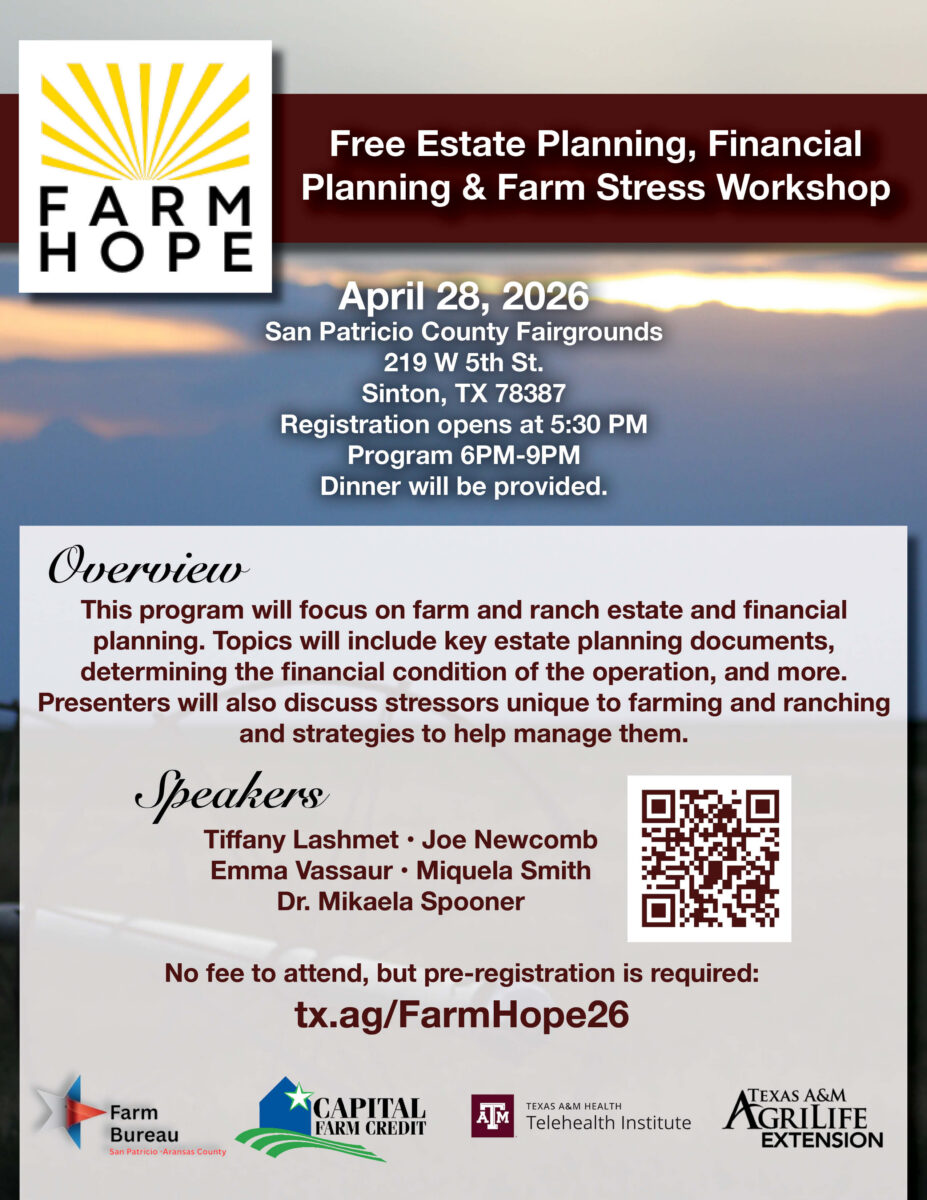 Join Capital Farm Credit for the Farm Hope Real Estate Planning, Financial Planning & Farm Stress Workshop in Sinton! This program will focus on farm and ranch real estate and financial planning. Topics will include key estate planning documents, determining the financial condition of the operation and more. Presenters will also discuss stressors unique to farming and ranching and strategies to help manage them.