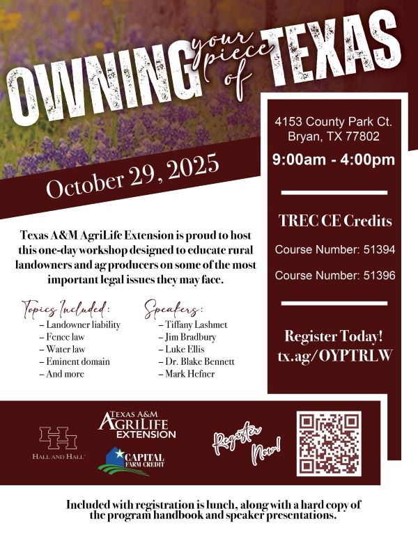 Texas A&M AgriLife Extension is proud to host this one-day workshop designed to educate rural landowners and agricultural producers on some of the most important legal issues they may face today. With expert speakers and practical resources, this program helps attendees better understand and navigate the complex challenges of land ownership.